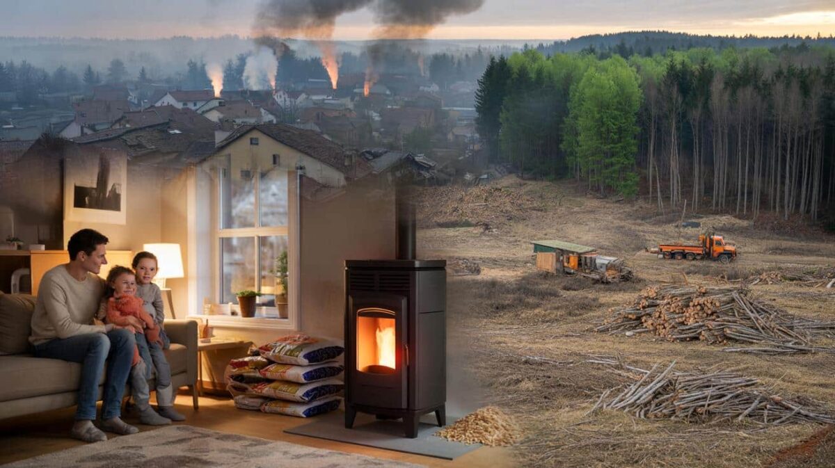 Aan de keukentafel tikt iemand op zijn telefoon: “Kijk, onze pelletkachel is supergroen, staat hier.” Er wordt geknikt, een beetje