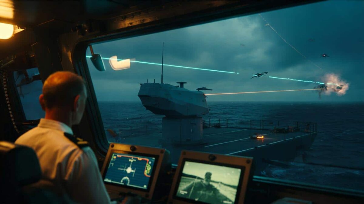 Geen knal, geen rookpluim, geen geur van buskruit. Alleen een onzichtbare straal, een fractie van een seconde, en de drone